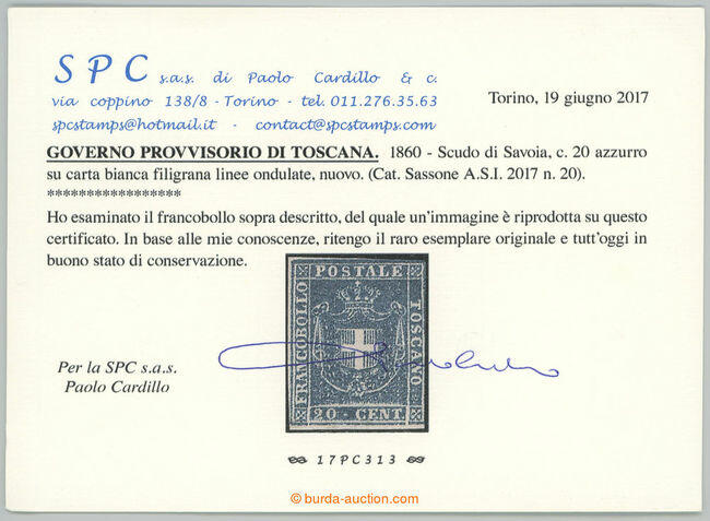 | Zusatzinformationen und Suchstichworte: | Burda 69. Auktion 10. - 11. September 2022 Los 76 Italien Staaten Neapel 1860 GOVERNO PROVVISORIO/Sass. 20, Wappen 20C blau; Pracht ungebraucht Briefstücks mit Originalgummi, Attest Cardillo, c. v. 32,000EUR, sehr seltene Marke Zuschlag 1.680,00 EUR |