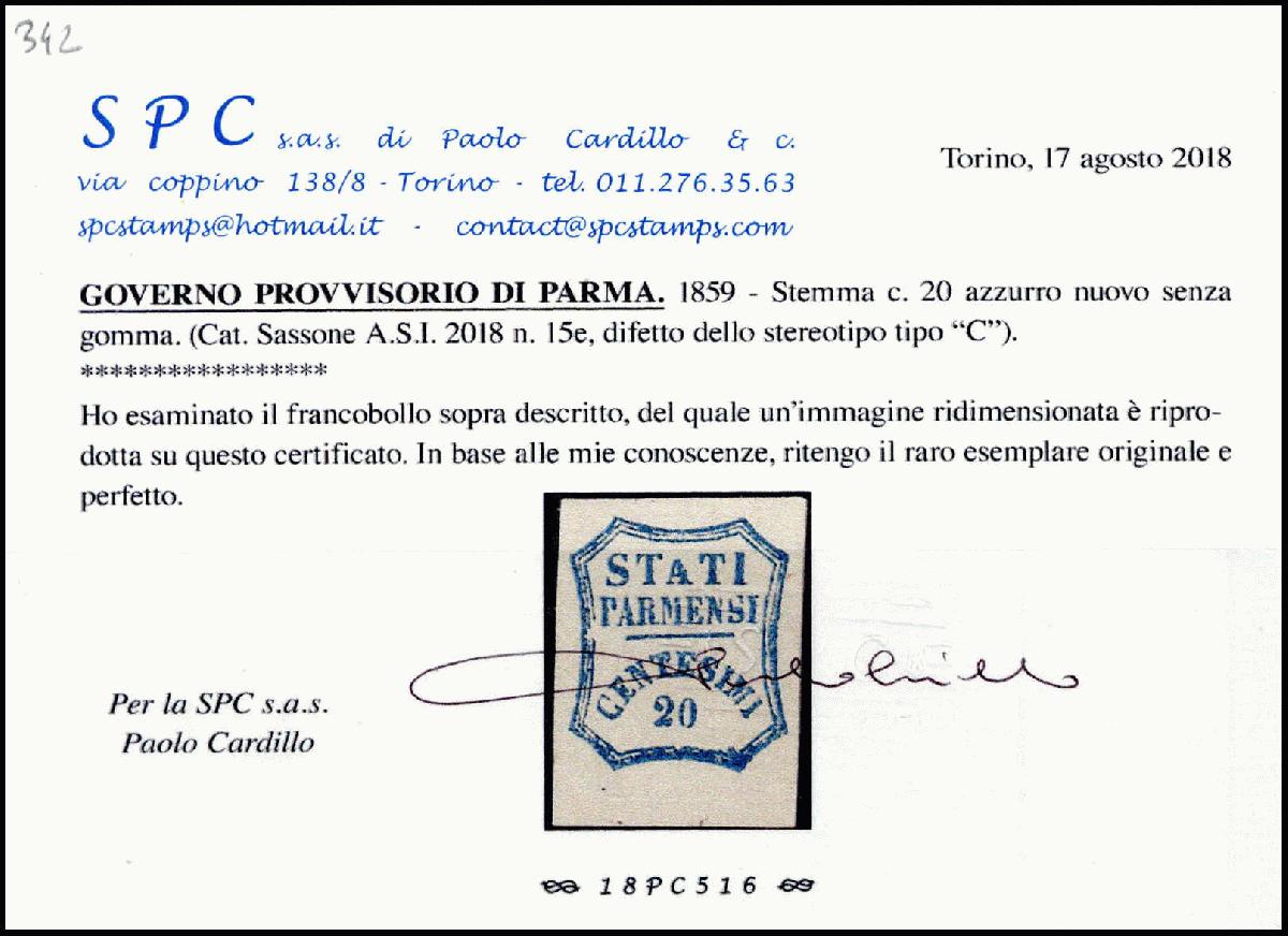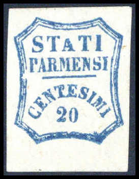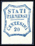 | Zusatzinformationen und Suchstichworte: | Württembergisches Auktionshaus 141. Versteigerung 09.-10. Dezember 2022 Los 1277 Italien Staaten Parma 20 C. blau, Plattenfehler: beschädigtes "C", frisches, ungebrauchtes Kabinettstück o.G. Selten, Fotoattest Cardillo (Sassone 15e = 3.250,-) Ausruf 300,00 EUR |