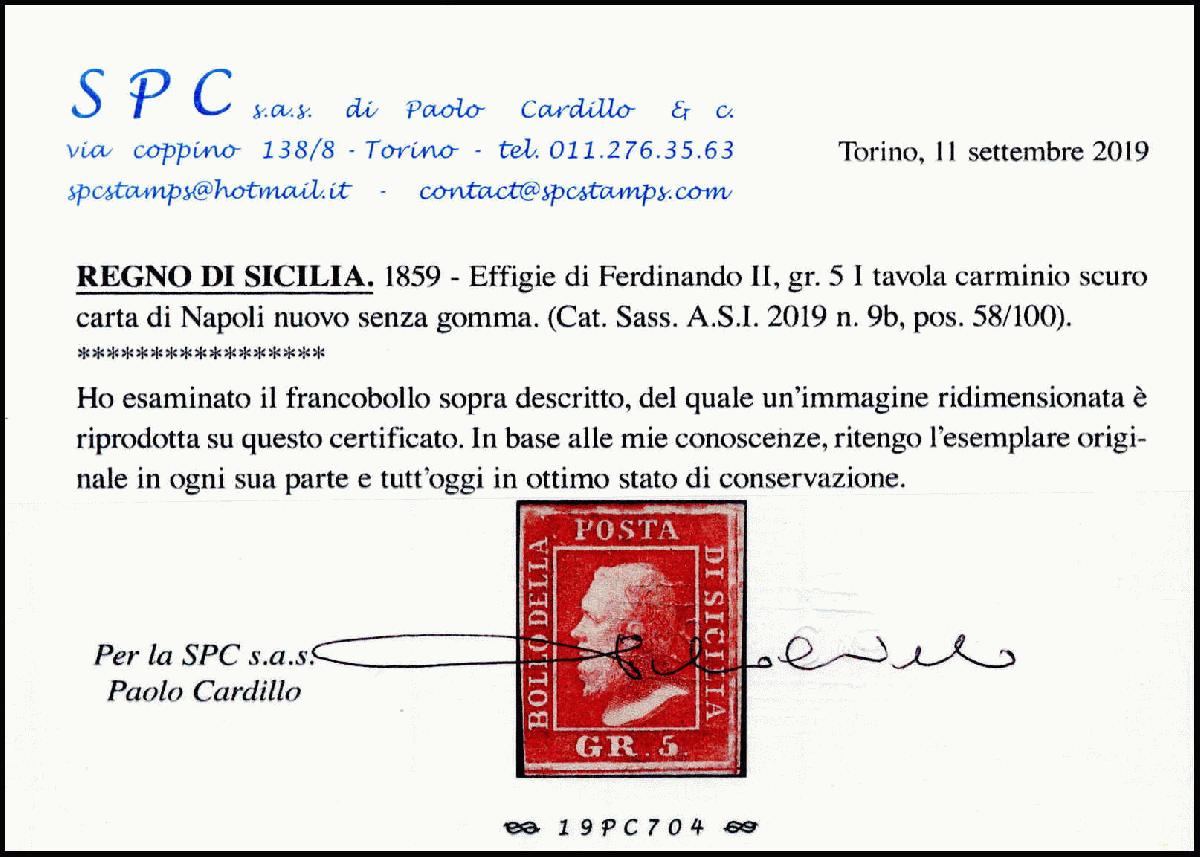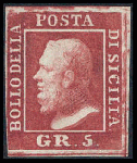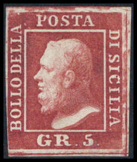 | Zusatzinformationen und Suchstichworte: | Württembergisches Auktionshaus 141. Versteigerung 09.-10. Dezember 2022 Los 1311 Italien Staaten Sizilien 5 Gr. carminio scuro, voll- bis breitrandiges, ungebrauchtes Prachtstück o.G. Eine sehr seltene Marke, Fotoattest Cardillo. (Sassone 9b = 7.500,-) Ausruf 400,00 EUR |