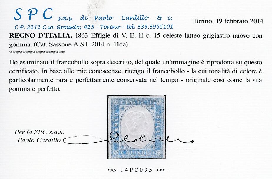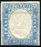| Zusatzinformationen und Suchstichworte: | Ferrario Aste - 6. Internetauktion 13. November 2022 Los 862 Italien Königreich - Vittorio Emanuele II 1863 - 15 cent. celeste latteo grigiastro tipo Sardegna (11da), gomma originale, perfetto. Molto fresco, rara tonalità. Cert. Cardillo. Cat. € 5500 Ausruf 500,00 EUR |