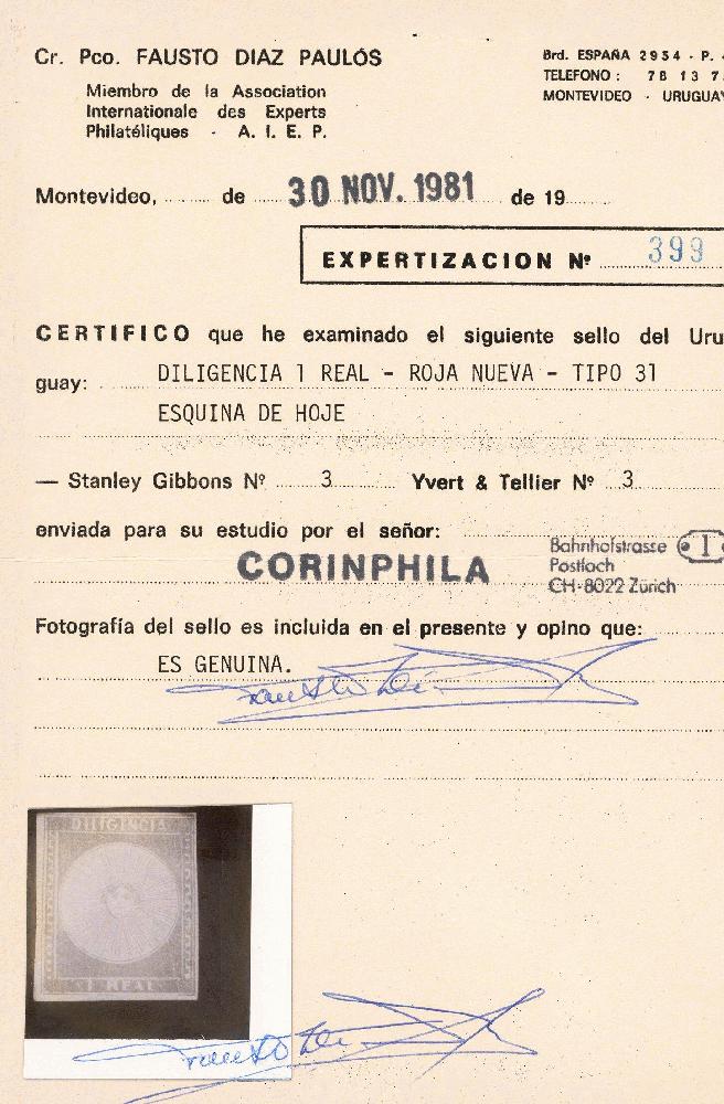 | Zusatzinformationen und Suchstichworte: | David Feldman S.A. - Alle Welt 5. - 9. Dezember 2022 Los 60913 Uruguay 1856,1 R. zinnober, ein herausragendes Stück von der linken unteren Bogenecke, Position 31, ausnahmsweise detailreicher Druck, ausgezeichnet gerandet, ungebraucht ohne Gummi, Pracht; Attest Díaz Paulos (1981) Ausruf 200,00 EUR |