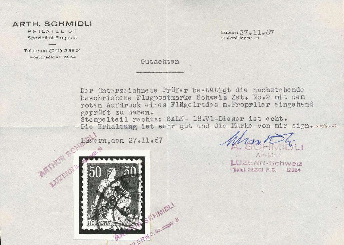 | Zusatzinformationen und Suchstichworte: | 153. MH Marken Auktion 8. - 9. September 2022 Los 828 Schweiz Flugpostmarken FLUGPOST (OFFIZIELLE AUSGABEN) Flügelrad-Audruck, 50 Rp.-Wert gestempelt Salsach 18.VI...., Gutachten Schmidli, Kat. 200.- Ausruf 40,00 CHF |