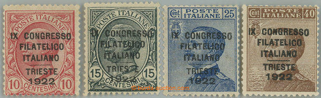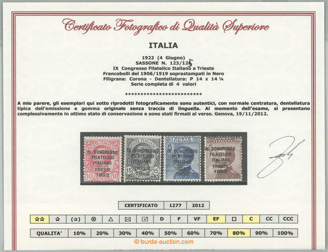 | Zusatzinformationen und Suchstichworte: | Burda 70. Auktion 19. November 2022 Los 66 Italien Republik 1922 Mi. 153-156, Philatelistischer Kongress Triest 10C - 40C; Pracht kompletter Satz, Attest Terrachini, Höchstwerts exp. Dieana, Richter, c. v. 1,800EUR, Sassone 4,000 EUR Ausruf 542,00 EUR |