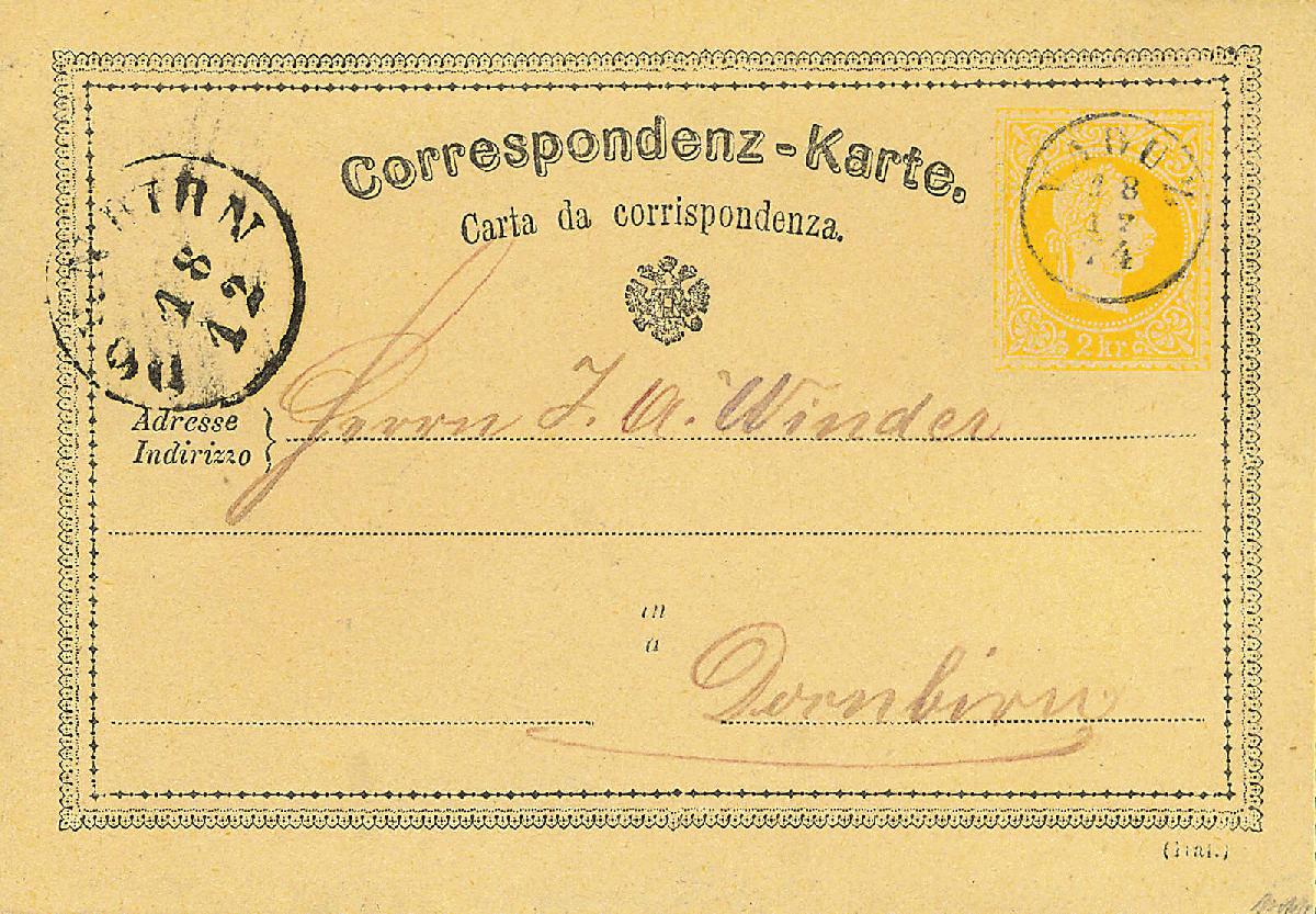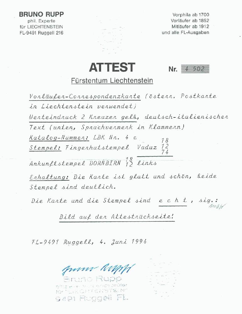 | Zusatzinformationen und Suchstichworte: | 113. Kirstein-Larisch Auktion 1. - 3. Dezember 2022 Los 1657 Liechtenstein LIECHTENSTEIN - VORLÄUFER ÖSTERREICH, 1867, Franz Joseph, 2 Kr. gelb, dt.-ital. Text, Pracht- Correspondenz- Karte mit Fingerhutstpl. "VADUZ 18 12 74" nach "DORNBIRN 18 12", sehr selten, gepr. mit Fotoattest Rupp Ausruf 480,00 EUR |