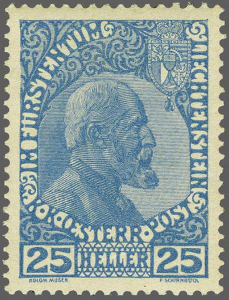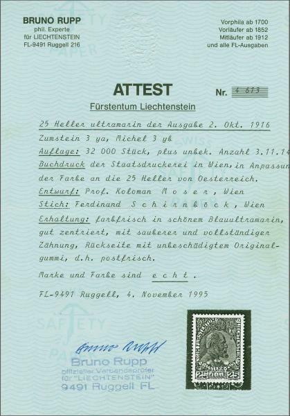 | Zusatzinformationen und Suchstichworte: | 291. - 297. Corinphila Auktion 28. November - 3. Dezember 2022 Los 9368 Liechtenstein 1916: 25 H ultramarin, "Fürst Johann II", gewöhnliches Papier, gezähntes Exemplar mit vollem Originalgummi, Attest Rupp (1995). SBK = CHF 2'000. Ausruf 250,00 CHF |
