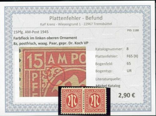 | Zusatzinformationen und Suchstichworte: | ebay.de 425869) Bizone AM-Post Paar Nr. 8 mit PLF F65 (II) **, Befund Krenz Preis 2,90 EUR |