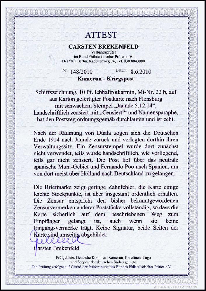 | Zusatzinformationen und Suchstichworte: | Württembergisches Auktionshaus 141. Versteigerung 10. Dezember 2022 Los 6463 Deutsche Kolonien Kamerun Kriegspost Handschriftliche Jaunde-Zensur: JAUNDE 5/12 14 auf selbstgefertigter Postkarte 10 Pfg. (kl. Mgl.) nach Flensburg. Li. oben mit handschriftlichem blauem Vermerk "Censiert!" nebst Namensparaphe des Zensors. Seltene Post über Fernando Poo nach Deutschland mit dieser ungewöhnlichen Ausgangszensur, Fotoattest Brekenfeld. Ausruf 300,00 EUR |