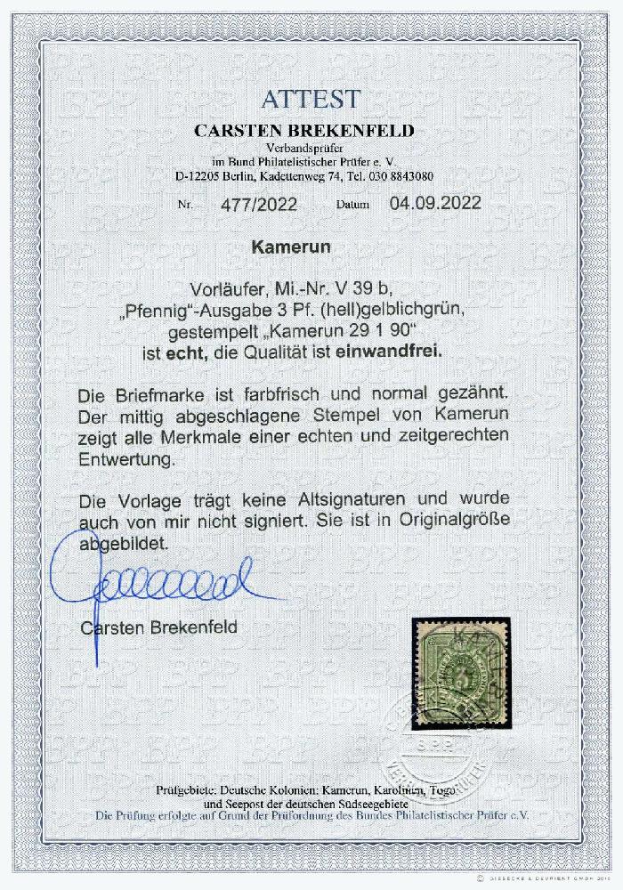 | Zusatzinformationen und Suchstichworte: | 31. Schlegel Auktionshaus Auktion 14. - 18. November 2022 Los 8822 Deutsche Kolonien Kamerun, Vorläufer 1890, 3 Pfg. der Ausgabe Pfennig (hell)gelblichgrün, gestempelt KAMERUN 29 1 90", farbfrisch und normal gezähnt, eiwandfrei, Fotoattest Brekenfeld 09/2022 (ME 2.000,-) Ausruf 700,00 EUR |