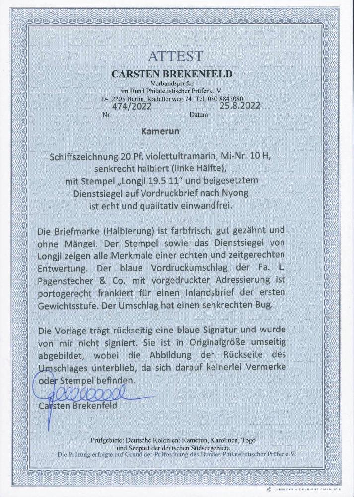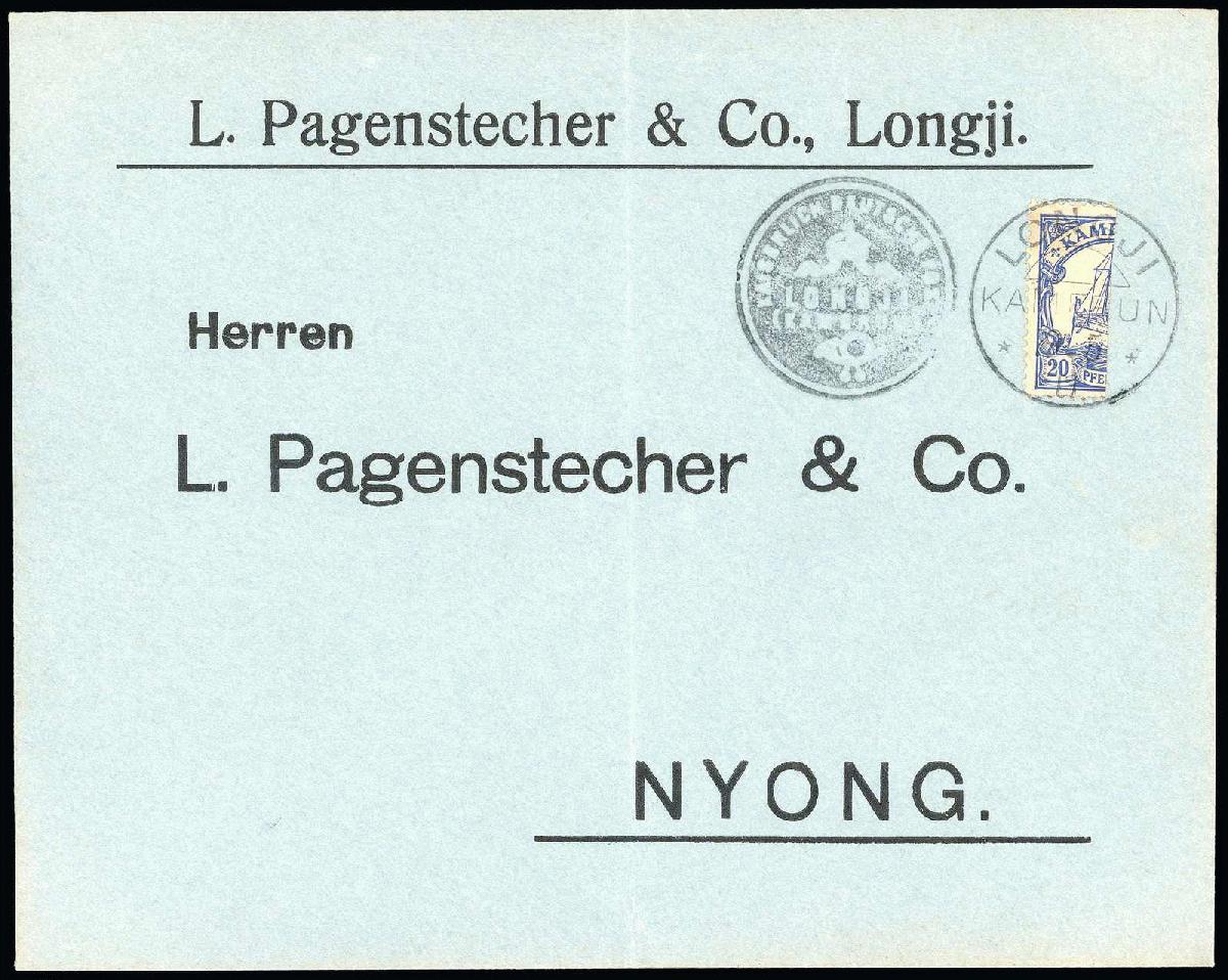 | Zusatzinformationen und Suchstichworte: | 31. Schlegel Auktionshaus Auktion 14. - 18. November 2022 Los 34 Deutsche Kolonien Kamerun 1911, 20 Pfg. Kaiseryacht, linke Hälfte eines halbierten 20 Pfg.-Wertes auf Firmenbrief, aufgegeben in "LONGJI 19 5 11", nebengesetztes Dienstsiegel, adressiert als Inlandsbrief nach Nyong, der Brief mit senkr. Bugspur außerhalb der Frankatur, sonst einwandfrei, Fotoattest Brekenfeld BPP 08/2022 (ME 9.000,-) Zuschlag 1.850,00 EUR |