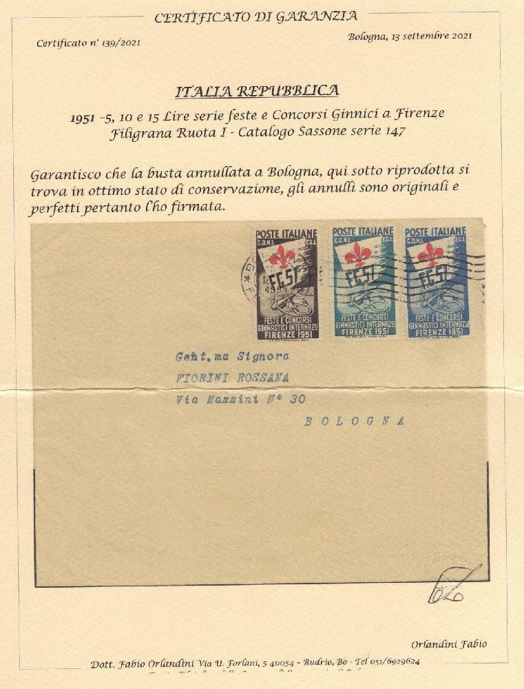 | Zusatzinformationen und Suchstichworte: | 6. Pilatusmail-Auktion 22. - 24. September 2022 Los 414 Italien 1951, Serie Wettspiele Florenz auf FDC (18.5.51), Bedarfsbrief, Attest Orlandini Ausruf 120,00 CHF |