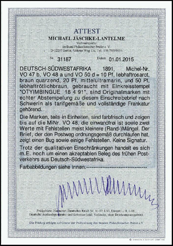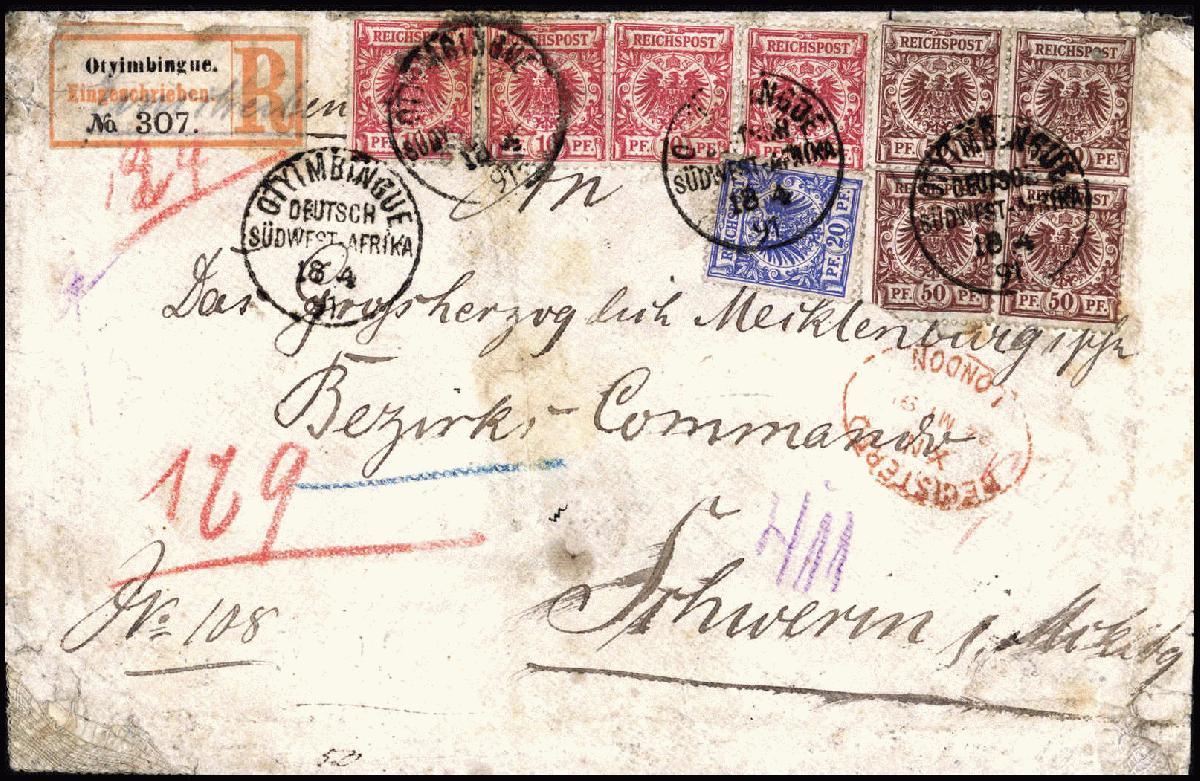 | Zusatzinformationen und Suchstichworte: | Württembergisches Auktionshaus 141. Versteigerung 10. Dezember 2022 Los 5980 + Deutsche Kolonien Südwestafrika Otyimbingue 10 Pfg., vier Exemplare mit 20 Pfg. ultramarin und viermal 50 Pfg. lilabraun als spektakuläre 2,60-Mark-Frankatur auf Einschreibebrief in der 12.Gewichtsstufe nach Dtld. Viermal aufges. Stempel OTYIMBINGUE DSWA 18/4 91, befördert über London, rs. Ak.-Stempel vom 29.5.1891. Die gesamte Frankatur in ausgezeichnet frischer Erhaltung, jedoch ebenso wie der Brief mit mehr oder weniger starken Beförd.-Spuren. Eine der höchsten bekannten Otjimbingue-Frankaturen überhaupt und ein äußerst dekoratives Stück, Fotoattest Jäschke-L.BPP. Ausruf 5.000,00 EUR |