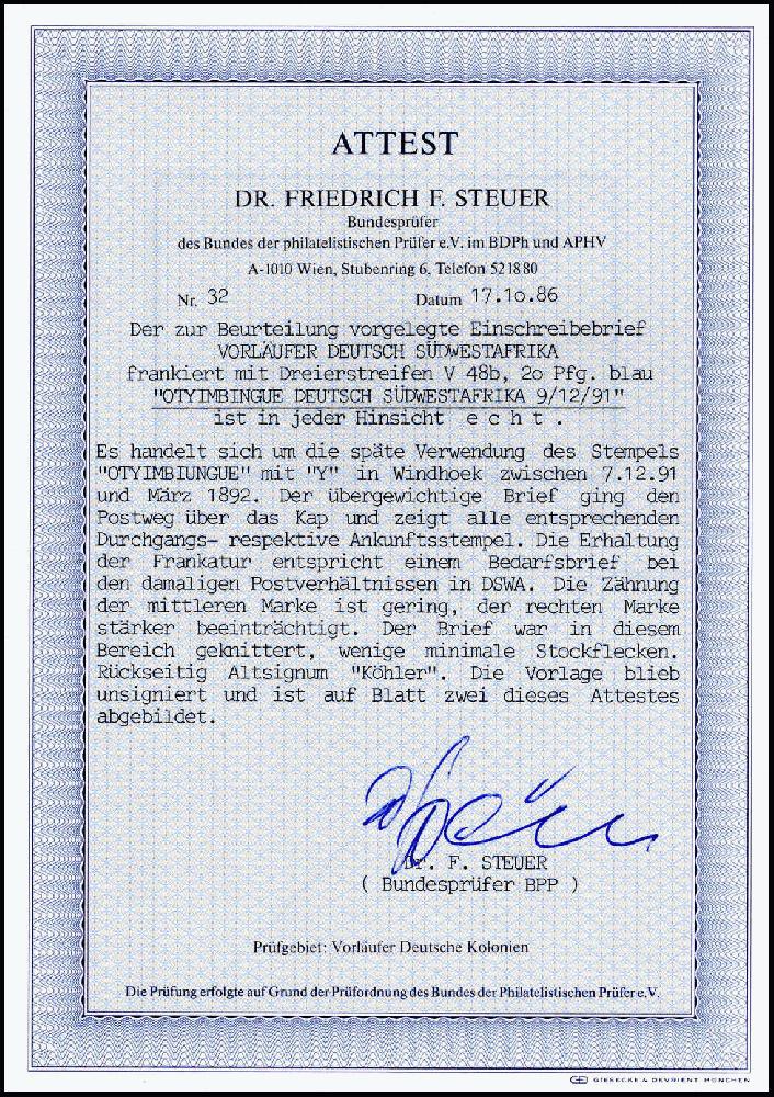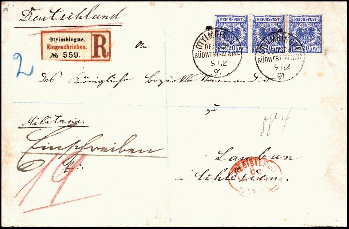 | Zusatzinformationen und Suchstichworte: | Württembergisches Auktionshaus 141. Versteigerung 10. Dezember 2022 Los 12 + Deutsche Kolonien Südwestafrika Otyimbingue 20 Pfg., erstklassig farbfrischer waagr. Dreierstreifen mit zwei sauber aufges. Stempeln OTYIMBINGUE DSWA 9/12 91 auf dekorativem Einschreibebrief in der 2. Gewichtsstufe nach Deutschland (kl. Mgl.). Einer der frühesten bekannten Otyimbingue-Briefe aus der letzten Periode (Verwendung in Windhoek), sign. Bühler, Fotoattest Dr.Steuer BPP Ausruf 1.200,00 EUR |