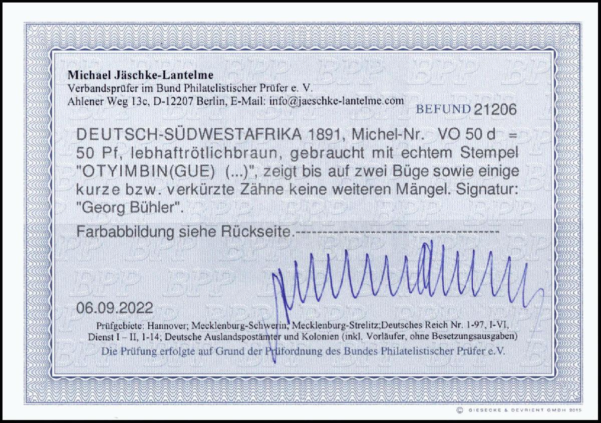 | Zusatzinformationen und Suchstichworte: | Württembergisches Auktionshaus 141. Versteigerung 10. Dezember 2022 Los 5981 Deutsche Kolonien Südwestafrika Otyimbingue 50 Pfg., schönes Exemplar mit klarem Stempel OTYIMBINGUE, kl. Mgl., sign. Bühler, Fotobefund Jäschke-L.BPP, Katalogpreis: 700,- Ausruf 150,00 EUR |