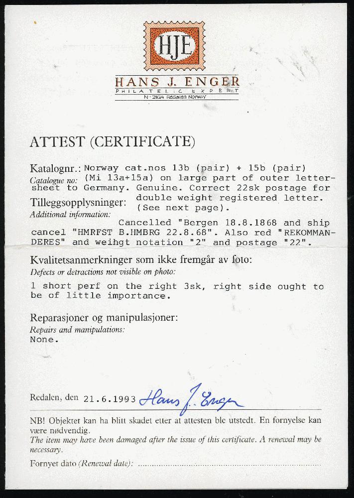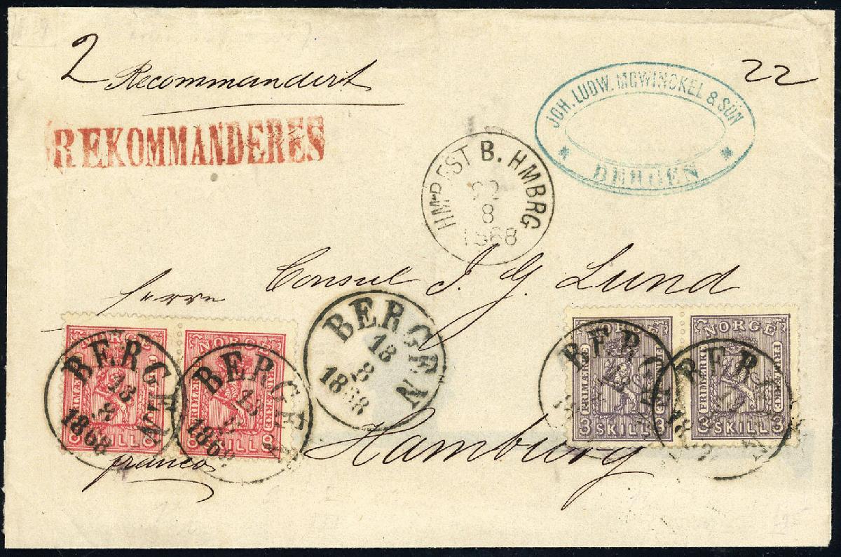 | Zusatzinformationen und Suchstichworte: | Skanfil Auktion - Herbst Auktion 2022 9. - 12. November 2022 Los 3796 Norwegen Wappen 1867 13a og 15b. Vannrett par av 3 skilling og 8 skilling = 22 skilling stemplet "Bergen 18.8.1868" på meget pent dobbeltvektig, litt ufullstendig brevomslag sendt rekommandert til Hamburg, Tyskland. På forsiden transittstemplet "Hmrfst B. Hmbrg 22.8.1868". Ankomststemplet. Eneste registrerte brev med denne kombinasjonen i NK Postal. Attest Zuschlag 11.500,00 NOK |
