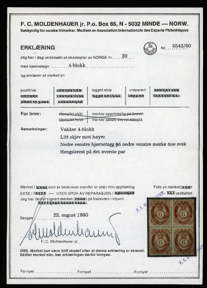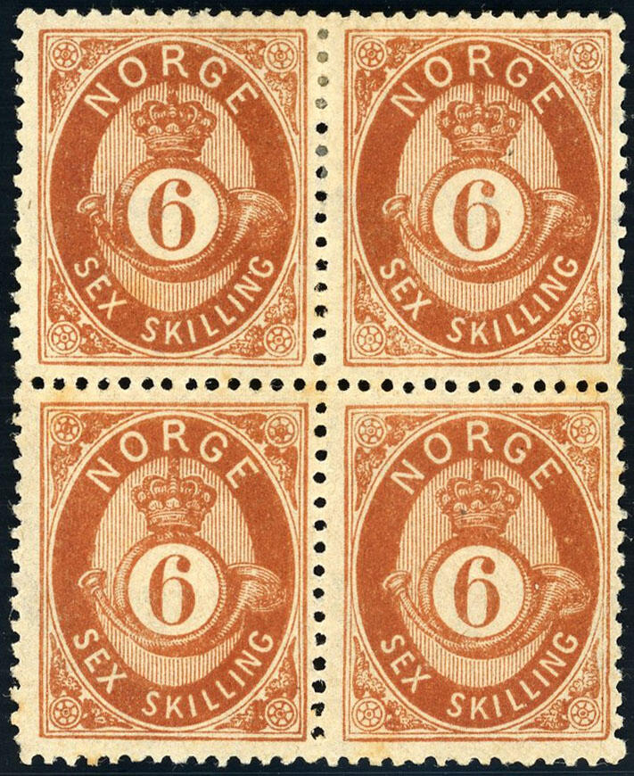 | Zusatzinformationen und Suchstichworte: | Skanfil Auktion - Herbst Auktion 2022 9. - 12. November 2022 Los 3849 Norwegen Skilling Posthorn 20. Vakker 4-blokk hvor de to nedre merkene er postfriske. Ubetydelig svak tagg i nedre venstre hjørne grunnet bred nederste tagg. Attest F.C.M Zuschlag 25.00,00 NOK |