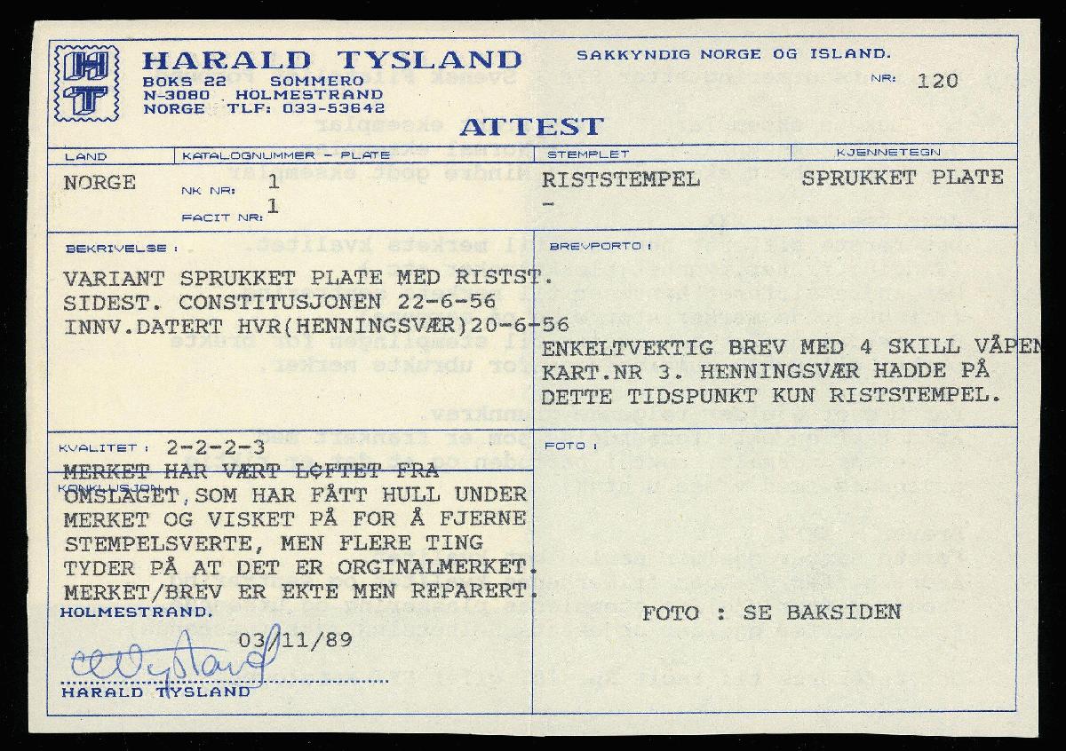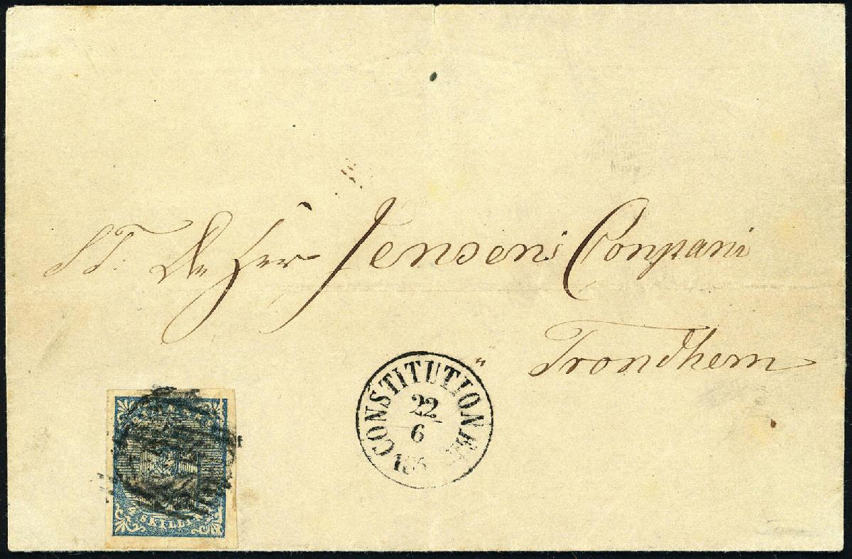 | Zusatzinformationen und Suchstichworte: | Skanfil Auktion - Herbst Auktion 2022 9. - 12. November 2022 Los 5329 Norwegen CONSTITUTIONEN - 4 skilling Våpen 1855 - rist-stemplet merke med variant "Sprukket Plate" på brevomslag sendt fra Henningsvær til Trondheim sidestemplet svart "Constitutionen 22.6.1856". På baksiden kareteringsnummer "3" og datering "Hvr 20.6.56". Merket har vært løftet fra omslaget, som har fått hull under merket. I følge attest Tysland er det flere ting som tyder på at det er originalmerket. Merket/brev er ekte men reparert Zuschlag 7.400,00 NOK |