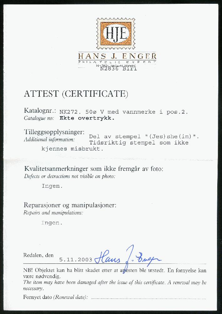 | Zusatzinformationen und Suchstichworte: | Skanfil Auktion - Herbst Auktion 2022 9. - 12. November 2022 Los 4290 Norwegen 1909-1945 Ausgaben 272. 50 øre V med vannmerke med del av stempel (Jes)she(im). Attest Enger Zuschlag 1.400,00 NOK |
