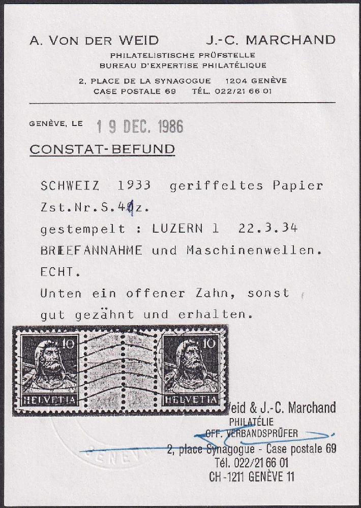 | Prüfer: | von der Weid, Alain (SBPV / ASEP (Schweizerischer Briefmarken-Prüfer-Verband)) |