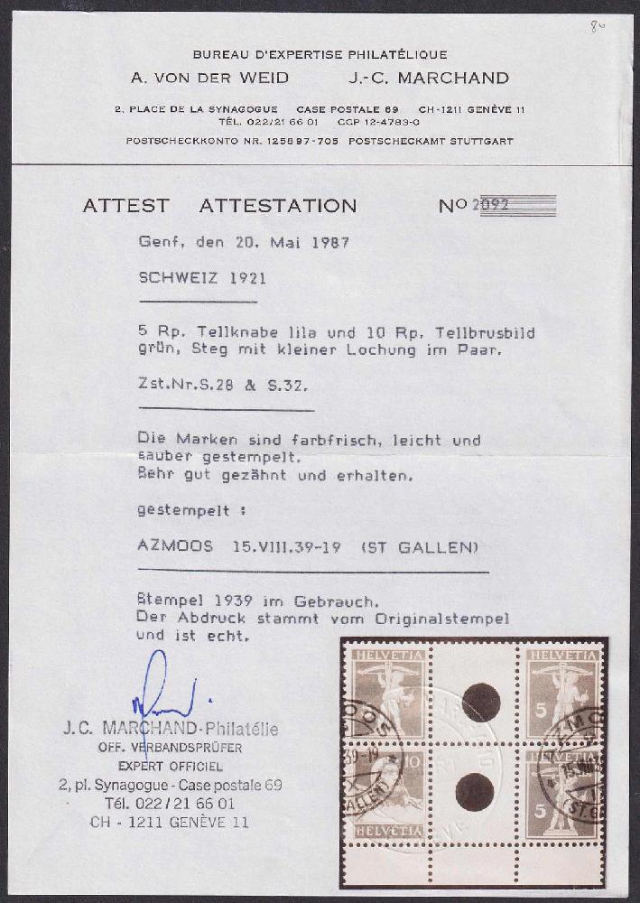 | Zusatzinformationen und Suchstichworte: | Luzernerraute Webshop Los 0000105051 Schweiz Zwischenstege S28, 10c+5c, fehlerfrei von AZMOOS (SG) mit unterem TAB, SBK: 2'500.- Atteste: Marchand (Kopie 87), Eichele (2021) Festpreis 850,00 CHF |