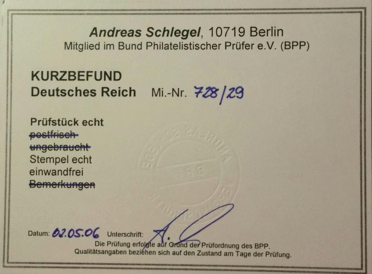 | Prüfer: | Schlegel, Andreas (BPP (Bund Philatelistischer Prüfer)) |