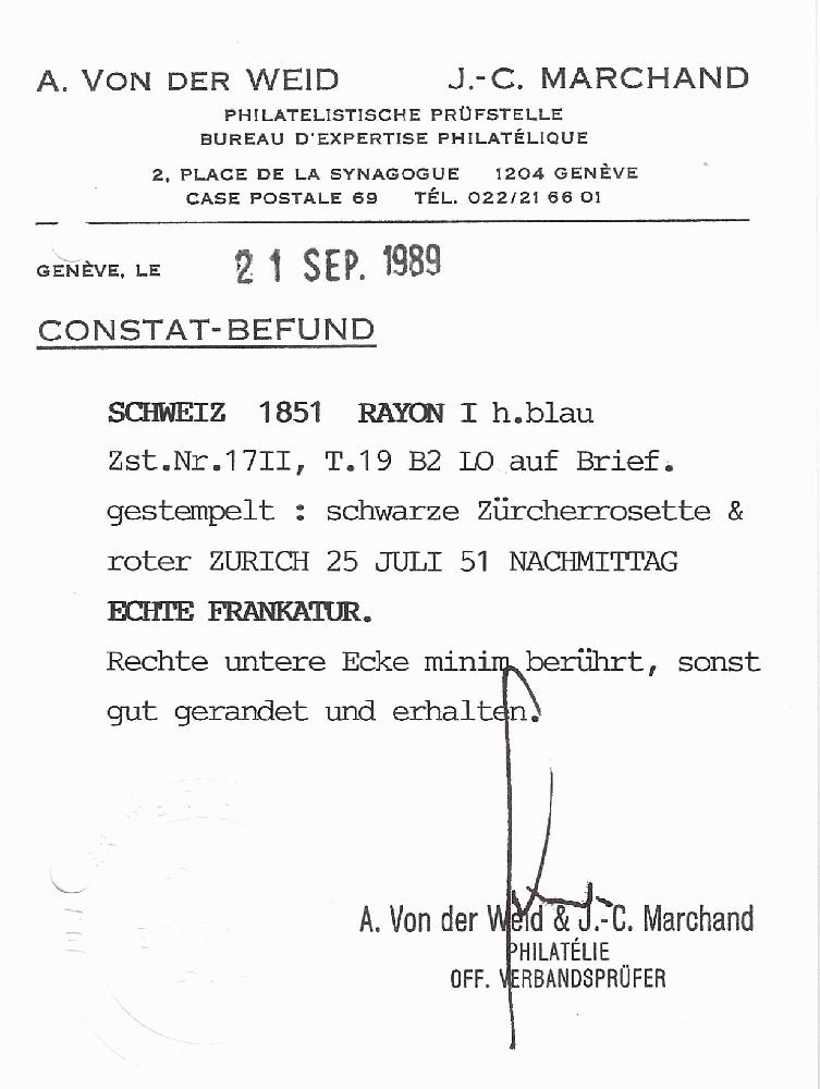 | Zusatzinformationen und Suchstichworte: | Honegger Philatelie AG - Jahresliste 2022 Los 390 Rayon I, hellblau, ohne KE (STEIN B2) Schöner Brief vom 25.07.51 mit Stein B2LO, Type 19 mit schwarzer Rosette von Zürich nach Pfäffikon ZH. In Ecke links oben berührt, sonst breitrandig, gut erhalten auf sauberem Brief. Befund Weid/Marchand Festpreis 750,00 CHF |