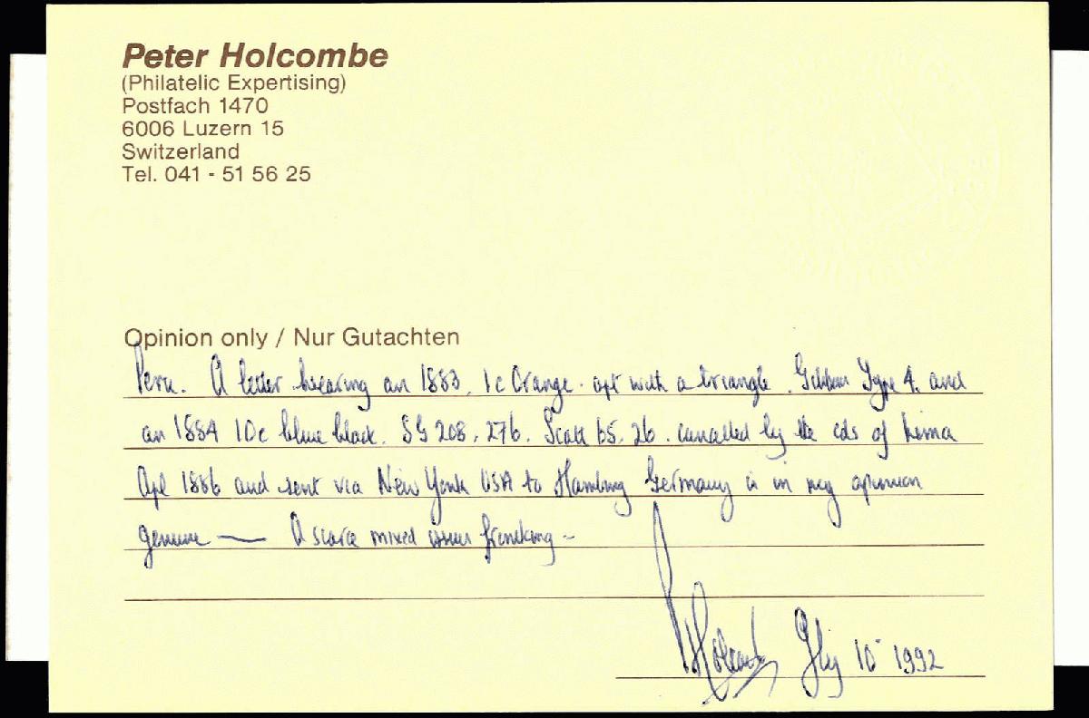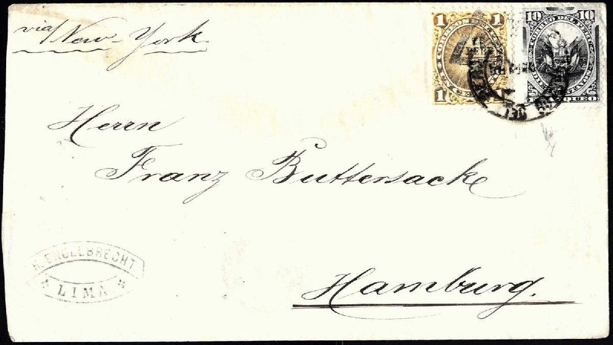 | Zusatzinformationen und Suchstichworte: | 75. Viennafil Live-Auktion 29. November - 2. Dezember 2022 Los 3393 Peru 1886, Brief von Peru über New-York nach Hamburg (Deutschland) frankiert mit Sonne 1 c. orange mit Aufdruck eines Dreiecks in Type IV und Wappen 10 c. schwarzschiefer, Attest Holcombe, Mi. 52 IV, 67 Ausruf 150,00 EUR |