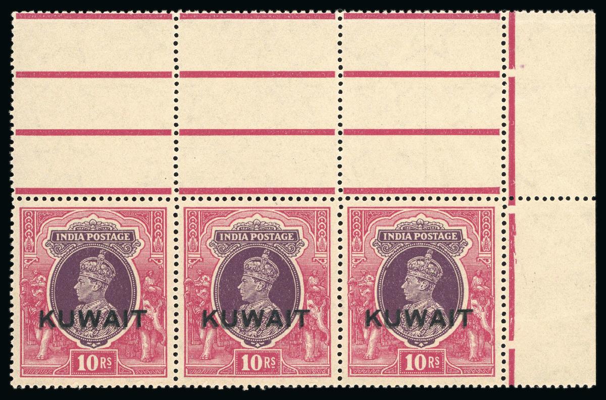 | Zusatzinformationen und Suchstichworte: | David Feldman S.A. - Great Britain and British Empire 5. - 9. Dezember 2022 Los 71224 Kuwait 1939, KGVI 10R purple & claret with double overprint variety in mint n.h. horizontal strip of three from the top right corner of a pane with gutter margins above, very fine and fresh, copy of BPA cert. when it was in a larger block (S.G. £2'100 as singles) Ausruf 1.500,00 GBP |
