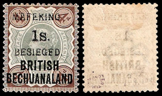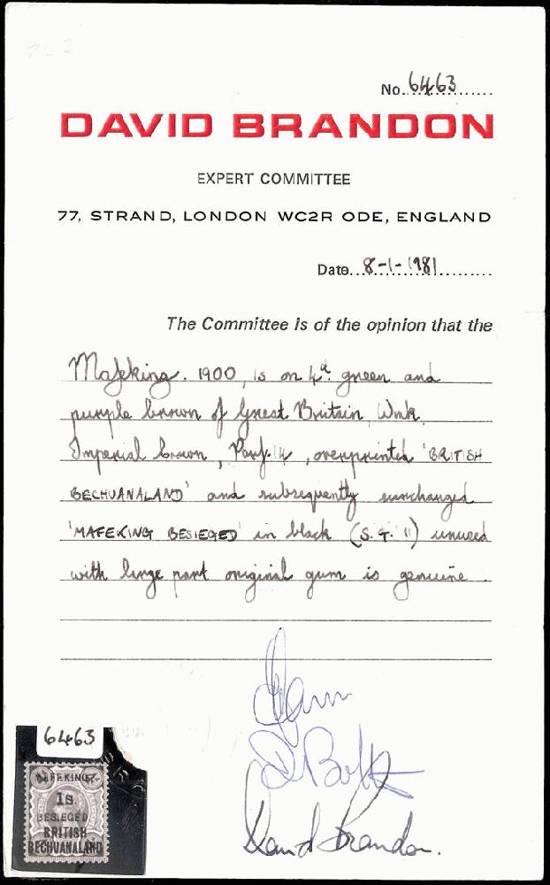 | Zusatzinformationen und Suchstichworte: | Filat AG Shop Neu Los 1488 (D) Kap der Guten Hoffnung 1900 1/- on 4d green & purple-brown of British Bechuanaland (SG 11 ovpt 5). VF/M example, fresh. 2320 overprinted, rare stamp mint. Photo-cert: Brandon. (cv£1600). See clickable image of certificate below. Festpreis 1.850,00 CHF |