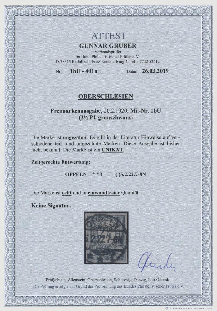 | Zusatzinformationen und Suchstichworte: | Christoph Gärtner 54. Auktion 18. - 19. Oktober 2022 Los 5272 D Oberschlesien 1920, UNGEZÄHNTE UNIKATE, 22 verschiedene, sowie ein weiteres Exemplar, zu dem nur 2 weitere bekannt sind. Eine einzigartige Garnitur der größten Raritäten und ein Spitzen-Ensemble der zahlreichen Facetten Oberschlesiens. Im einzelnen handelt es sich um die Michelnummern1-2, 7-8, 13 - 27, 29 und 41 - 43 U, alle zeitgerecht entwertet und bis auf MiNr 22, 41-43 tadellos erhalten, jeweils mit einem Fotoattest Gruber BPP Ausruf 15.000,00 EUR |