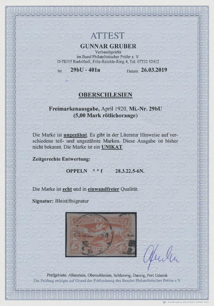| Zusatzinformationen und Suchstichworte: | Christoph Gärtner 54. Auktion 18. - 19. Oktober 2022 Los 5272 D Oberschlesien 1920, UNGEZÄHNTE UNIKATE, 22 verschiedene, sowie ein weiteres Exemplar, zu dem nur 2 weitere bekannt sind. Eine einzigartige Garnitur der größten Raritäten und ein Spitzen-Ensemble der zahlreichen Facetten Oberschlesiens. Im einzelnen handelt es sich um die Michelnummern1-2, 7-8, 13 - 27, 29 und 41 - 43 U, alle zeitgerecht entwertet und bis auf MiNr 22, 41-43 tadellos erhalten, jeweils mit einem Fotoattest Gruber BPP Ausruf 15.000,00 EUR |