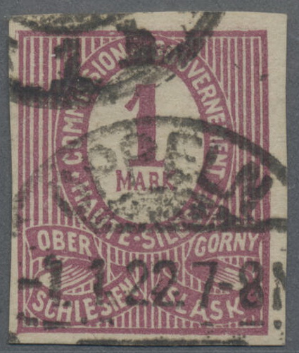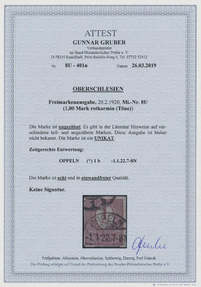 | Zusatzinformationen und Suchstichworte: | Christoph Gärtner 54. Auktion 18. - 19. Oktober 2022 Los 5272 D Oberschlesien 1920, UNGEZÄHNTE UNIKATE, 22 verschiedene, sowie ein weiteres Exemplar, zu dem nur 2 weitere bekannt sind. Eine einzigartige Garnitur der größten Raritäten und ein Spitzen-Ensemble der zahlreichen Facetten Oberschlesiens. Im einzelnen handelt es sich um die Michelnummern1-2, 7-8, 13 - 27, 29 und 41 - 43 U, alle zeitgerecht entwertet und bis auf MiNr 22, 41-43 tadellos erhalten, jeweils mit einem Fotoattest Gruber BPP Ausruf 15.000,00 EUR |