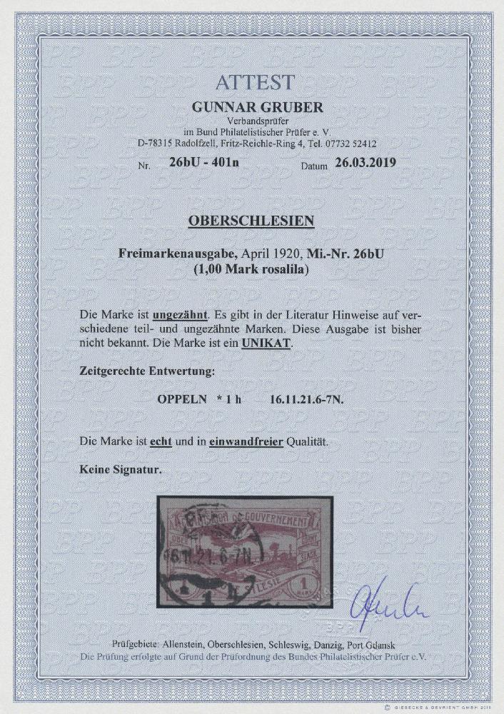 | Zusatzinformationen und Suchstichworte: | Christoph Gärtner 54. Auktion 18. - 19. Oktober 2022 Los 5272 D Oberschlesien 1920, UNGEZÄHNTE UNIKATE, 22 verschiedene, sowie ein weiteres Exemplar, zu dem nur 2 weitere bekannt sind. Eine einzigartige Garnitur der größten Raritäten und ein Spitzen-Ensemble der zahlreichen Facetten Oberschlesiens. Im einzelnen handelt es sich um die Michelnummern1-2, 7-8, 13 - 27, 29 und 41 - 43 U, alle zeitgerecht entwertet und bis auf MiNr 22, 41-43 tadellos erhalten, jeweils mit einem Fotoattest Gruber BPP Ausruf 15.000,00 EUR |