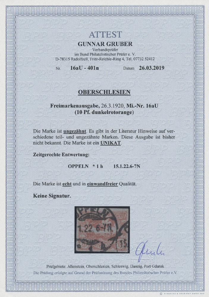 | Zusatzinformationen und Suchstichworte: | Christoph Gärtner 54. Auktion 18. - 19. Oktober 2022 Los 5272 D Oberschlesien 1920, UNGEZÄHNTE UNIKATE, 22 verschiedene, sowie ein weiteres Exemplar, zu dem nur 2 weitere bekannt sind. Eine einzigartige Garnitur der größten Raritäten und ein Spitzen-Ensemble der zahlreichen Facetten Oberschlesiens. Im einzelnen handelt es sich um die Michelnummern1-2, 7-8, 13 - 27, 29 und 41 - 43 U, alle zeitgerecht entwertet und bis auf MiNr 22, 41-43 tadellos erhalten, jeweils mit einem Fotoattest Gruber BPP Ausruf 15.000,00 EUR |