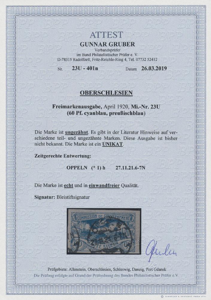 | Zusatzinformationen und Suchstichworte: | Christoph Gärtner 54. Auktion 18. - 19. Oktober 2022 Los 5272 D Oberschlesien 1920, UNGEZÄHNTE UNIKATE, 22 verschiedene, sowie ein weiteres Exemplar, zu dem nur 2 weitere bekannt sind. Eine einzigartige Garnitur der größten Raritäten und ein Spitzen-Ensemble der zahlreichen Facetten Oberschlesiens. Im einzelnen handelt es sich um die Michelnummern1-2, 7-8, 13 - 27, 29 und 41 - 43 U, alle zeitgerecht entwertet und bis auf MiNr 22, 41-43 tadellos erhalten, jeweils mit einem Fotoattest Gruber BPP Ausruf 15.000,00 EUR |