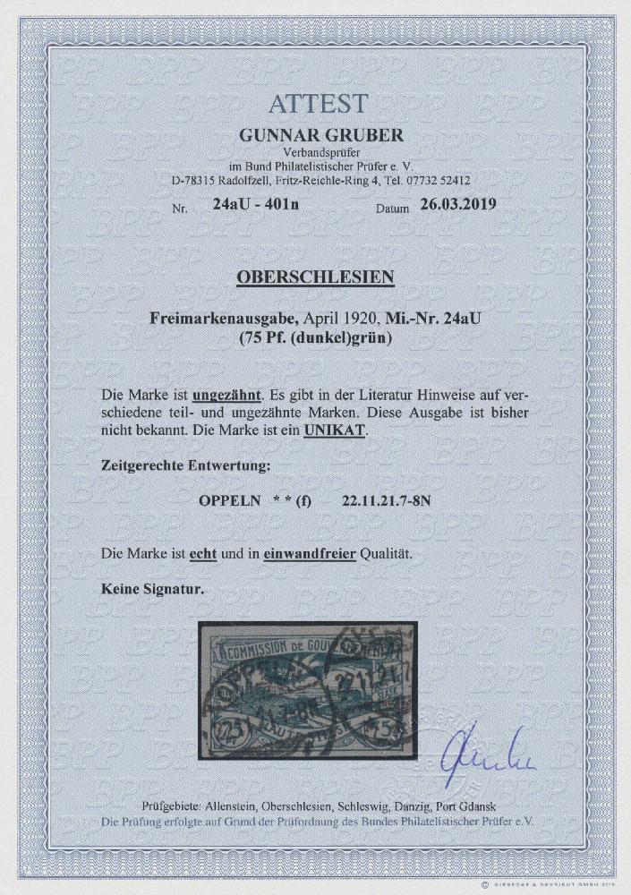 | Zusatzinformationen und Suchstichworte: | Christoph Gärtner 54. Auktion 18. - 19. Oktober 2022 Los 5272 D Oberschlesien 1920, UNGEZÄHNTE UNIKATE, 22 verschiedene, sowie ein weiteres Exemplar, zu dem nur 2 weitere bekannt sind. Eine einzigartige Garnitur der größten Raritäten und ein Spitzen-Ensemble der zahlreichen Facetten Oberschlesiens. Im einzelnen handelt es sich um die Michelnummern1-2, 7-8, 13 - 27, 29 und 41 - 43 U, alle zeitgerecht entwertet und bis auf MiNr 22, 41-43 tadellos erhalten, jeweils mit einem Fotoattest Gruber BPP Ausruf 15.000,00 EUR |