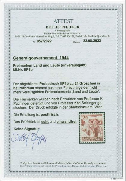 | Zusatzinformationen und Suchstichworte: | 291. - 297. Corinphila Auktion 28. November - 3. Dezember 2022 Los 414 Generalgouvernement 1944: Nicht herausgegebene Freimarken-Serie 'Land und Leute', Probedruck Goralenpaar 24 (Gr.) hellrotbraun in postfrischer Erhaltung. Attest Pfeiffer (2022) Mi = € 1'500. Ausruf 300,00 CHF |