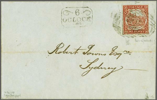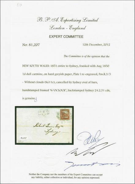 | Zusatzinformationen und Suchstichworte: | 291. - 297. Corinphila Auktion 28. November - 3. Dezember 2022 Los 4 Neusuedwales 1850 (Aug.): Sydney View 1 d. dull carmine on greyish paper, Plate II, a used example (Row 3, stamp 5 / position 15) thus showing the "Without Clouds" variety, with huge even margins all round, tied to 1851 local Sydney cover by oval of bars obliterator in black, the cancellation leaving the variety clear. Framed "6 / O CLOCK" marking alongside and reverse with "SYDNEY / ♚ / NEW SOUTH WALES" circular datestamp in black (Feb. 24). Cover #74 in the Palmer census. An exceptional and extremely fine usage, the finest of but two recorded thus - the other, ex Frajola, had the 'No Clouds' variety obliterated by the cancellation. An exhibition item of the highest quality. Signed Holcombe. Cert. BPA (2012). Provenance: H.R.Harmer, London, 19 May 1930, lot 122; Harmers, New York, 13 Nov 1980; Christie's, London, 24 April 1990, lot 847; Millenium, Sydney, 7 Nov 2012, lot 80 Ausruf 15.000,00 CHF |