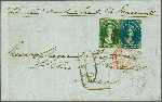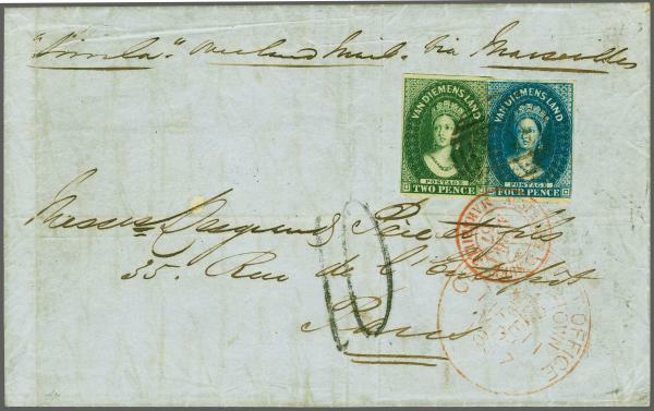 | Zusatzinformationen und Suchstichworte: | 291. - 297. Corinphila Auktion 28. November - 3. Dezember 2022 Los 9 Tasmanien 1855: 2 d. green, wmk. Star, a fine large margined example overlapped by 4 d. blue, just touched to large margins, used on 1857 entire letter from Hobart to Paris endorsed "Simla, Overland Mail via Marseilles", cancelled in black by '61' numeral obliterator - the maiden voyage of the European & Australia Royal Mail "Simla". Circular GENERAL POST OFFICE / HOBART TOWN / ♚" datestamp (Feb 11). The adhesives also tied by circular "AUSTRALIE V. SUEZ / MARSEILLE" datestamp (April 3) in red, charged with handstruck '10' décimes marking in black. Some file folds not detracting from the appearance and could be refolded at left, a rare centire. Cert BPA (2021). Provenance: Maurice Jamet, Paris, Dec 1962, lot 933; Collection Jack Blanc. Ausruf 1.500,00 CHF |
