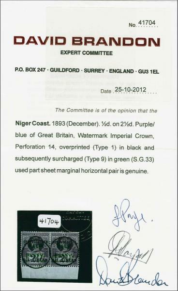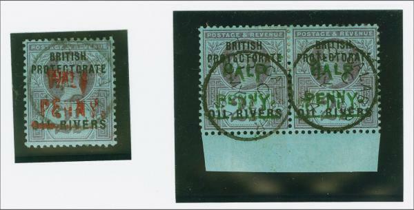 | Zusatzinformationen und Suchstichworte: | 291. - 297. Corinphila Auktion 28. November - 3. Dezember 2022 Los 232 Nigeria Issued at Old Calabar 1893 (Dec.): 'HALF / PENNY' in green on Great Britain 2½ d. purple on blue, used horizontal pair, marginal from bottom of sheet with Gibbons Type 9 handstamped surcharge, neatly cancelled by "Old Calabar River" circular datestamp (May 25, 1894) in black with Cert. Brandon (2012) together with another used example of 'HALF / PENNY' in vermilion on Great Britain 2½ d. purple on blue with Gibbons Type 4 handstamped surcharge in vermilion Gi. = £ 1'325. Ausruf 300,00 CHF |
