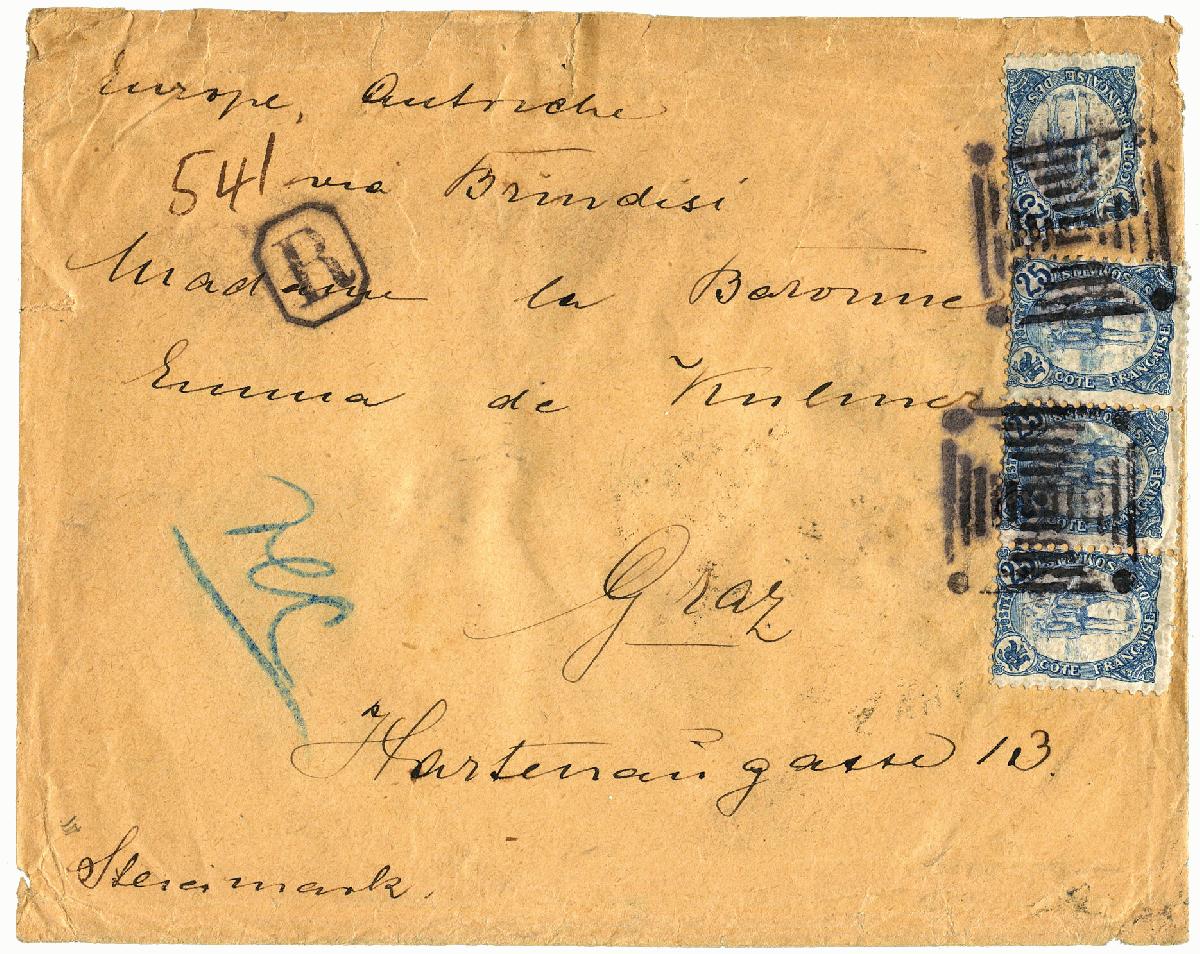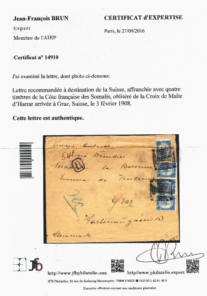 | Zusatzinformationen und Suchstichworte: | Lugdunum 123. Auktion 5. Dezember 2022 Los 621 Äthiopien Äthiopien - "CROIX DE MALTE" : 1908 COTE DES SOMALIS 25c (x 4) Stempel bei sehr selten "Malteserkreuz" Stempel auf eingeschriebenem Brief nach Österreich. Äußerst selten Entwertung, wahrscheinlich ein Unikat auf Einschreibebrief. J. F Brun Attest (2016). Vvf Ausruf 2.500,00 EUR |