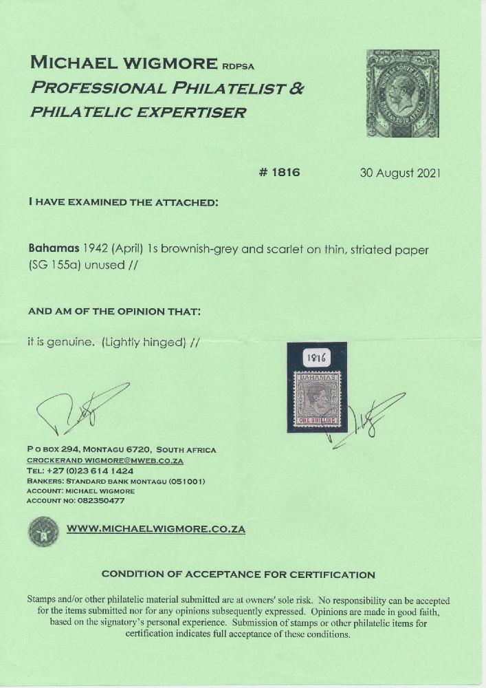 | Zusatzinformationen und Suchstichworte: | Doreen Royan & Associates Shop - Online Los 21322 Bahamas Bahamas 1942 (April) 1/- Brownish grey and scarlet (thin striated paper). Superb mounted mint condition. Michael Wigmore (RDPSA) Certificate No. 1816 (2021). SCARCE. Festpreis 800,00 GBP |