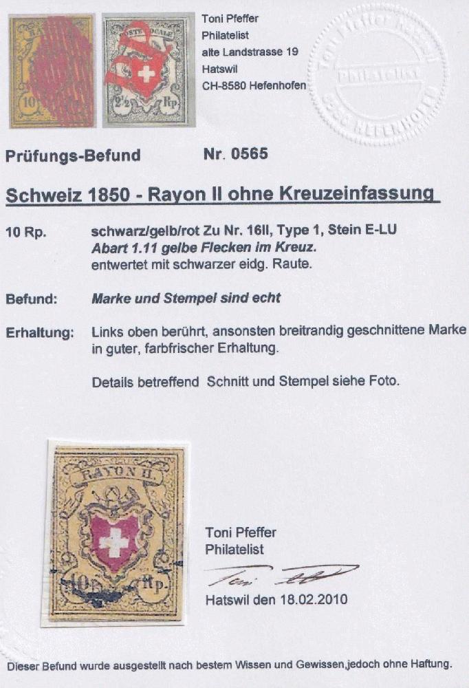 | Zusatzinformationen und Suchstichworte: | Luzernerraute Webshop Los 0002600335 Rayon II, gelb, ohne Kreuzeinfassung (STEIN E) T.1 E-LU, gelbe Flecken im Kreuz + stark marmorierter Gelbdruck, oben links getroffen, sonst breitrandig und in guter Erhaltung, Befund Pfeffer (10) interessante Abartenkombination Festpreis 125,00 CHF |
