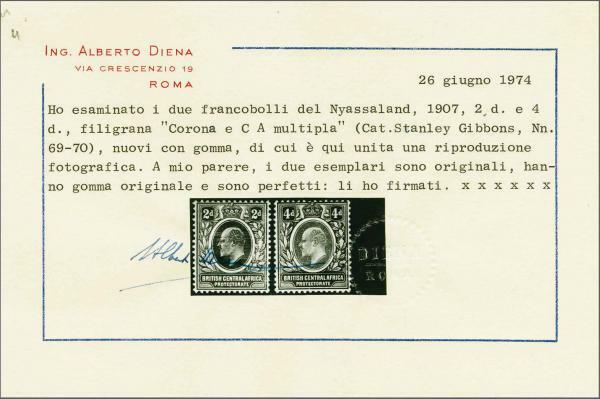 | Zusatzinformationen und Suchstichworte: | 291. - 297. Corinphila Auktion 28. November - 3. Dezember 2022 Los 6503 Nyassaland Brit. Zentralafrika 1907: 2 d. dull and bright purple and 4 d. grey-green & black, wmk. Multiple Crown CA on chalk surfaced paper, unused examples of these great rarities, prepared but unissued due to the name change from British Central Africa to Nyasaland Protectorate, each of fresh colour and fine, if slightly aged, large part og., sold together with the somewhat less valuable 1 d. and 6 d. values from the set. Delightful and extraordinarily rare "it is estimated that no more than a dozen examples of each remain in collector's hands" - Stanley Gibbons. Signed A. Diena. Cert. A. Diena (1974) Gi = £ 38'000. Note: 18 examples of each stamp reached the philatelic market, a block of ten (since divided), a block of four housed in the collection of His Majesty King Charles III, a pair and two single examples. Single sets are also to be found in the Royal Collection and in the British Library Collection. This leaves a dozen sets as SG state in the British Commonwealth catalogue. Ausruf 15.000,00 CHF |