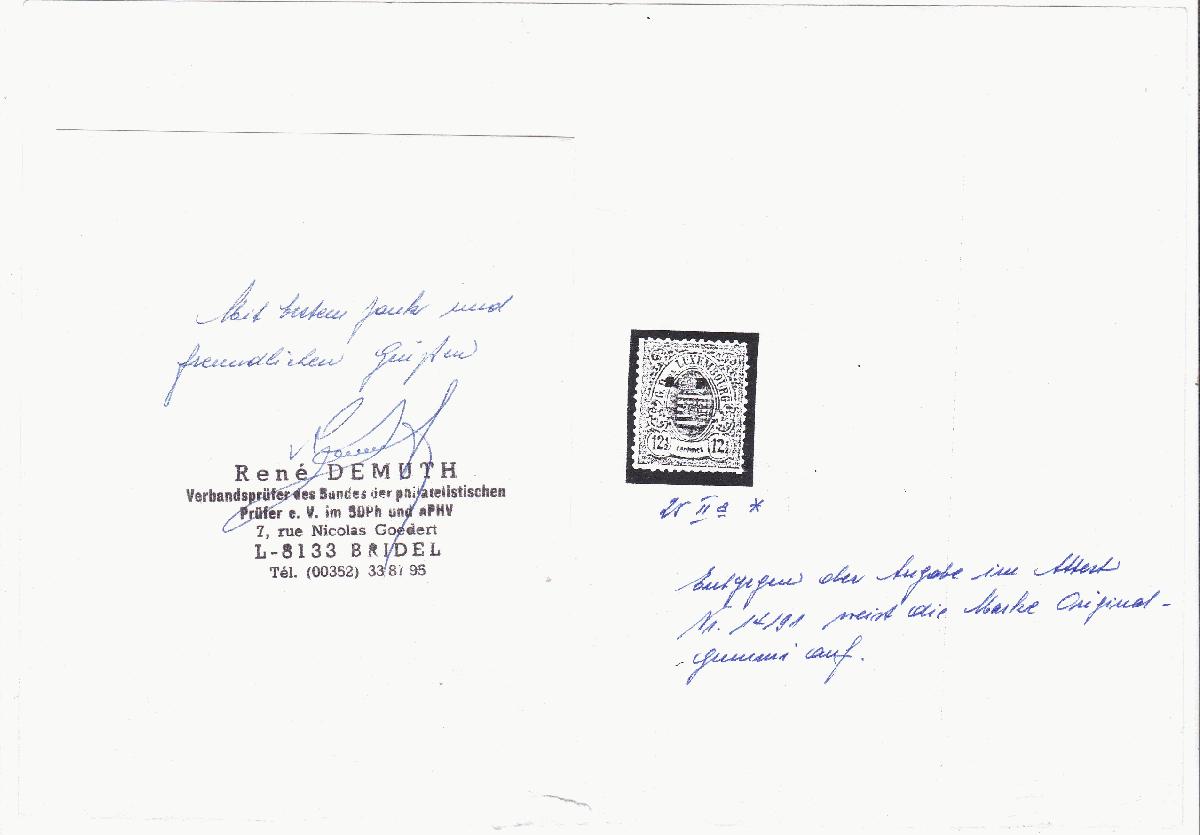 | Zusatzinformationen und Suchstichworte: | Zu Bild 2: Beide Zettel lagen einzeln bei und beziehen sich auf das ältere Attest: http://www.briefmarken-atteste.de/atteste/zeigen/1408 Der Verfasser ist auch beim zweiten Bild wohl Herr Demuth (anhand des Schriftvergleichs). Farbe der 3. Auflage. |