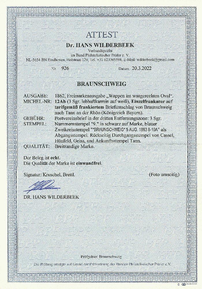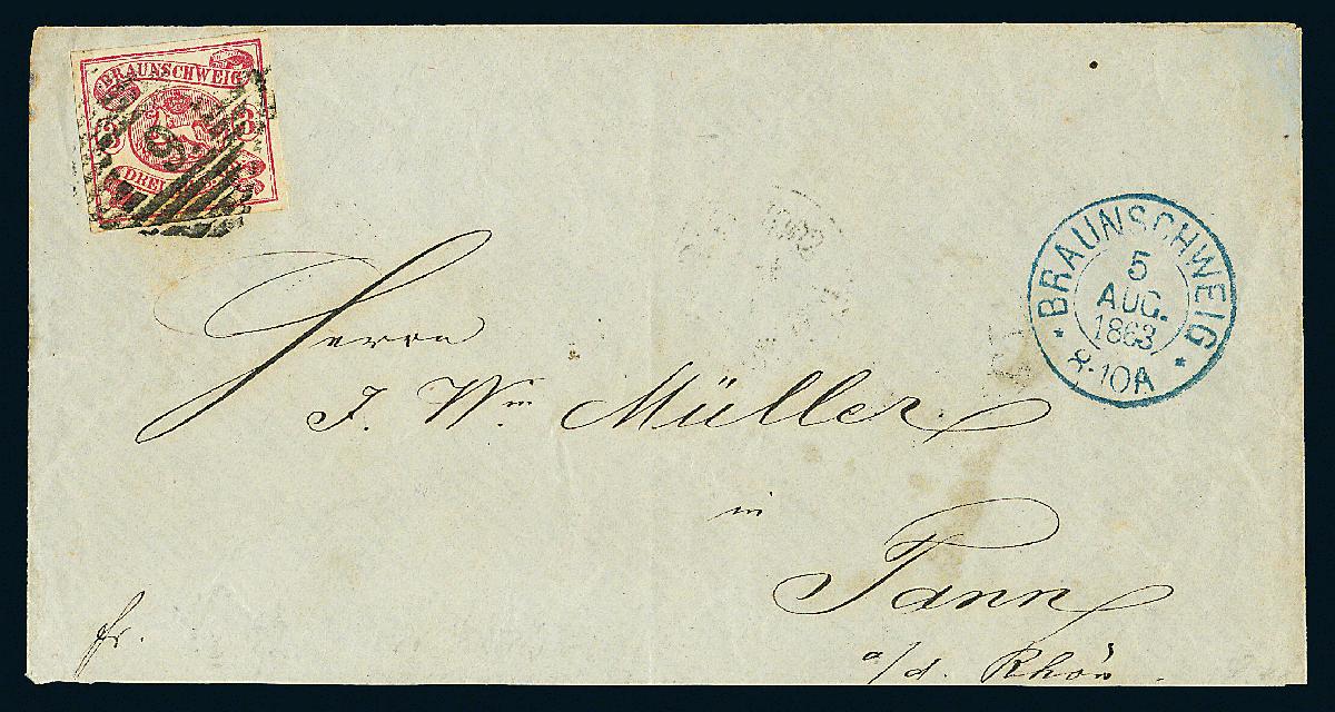 | Zusatzinformationen und Suchstichworte: | Dr. Derichs 168. Auktion 2. - 3. Dezember 2022 Los 896 Altdeutschland Braunschweig 3 Sgr. lebhaftkarmin, gute "b"-Farbe, vierseitig breitrandig auf Postvereinsbrief mit schwarzem Nummernstempel "9." und blauem Aufgabe-K2 "Braunschweig 5 Aug.1863" nach Tann an der Rhön/Königreich Bayern, rückseitig mit Ankunftstempel und Thurn & Taxis-Durchgangsstempeln von Cassel, Hünfeld und Geisa. Kabinett. Geprüft Brettl BPP und neues Fotoattest Dr. Wilderbeek BPP: "Die Qualität der Marke ist einwandfrei.". (Michel 700.-). Zuschlag 420,00 EUR |
