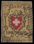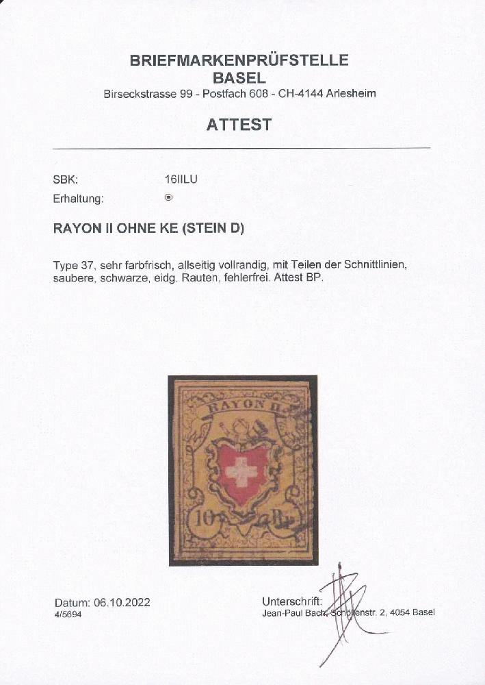 | Zusatzinformationen und Suchstichworte: | 156. MH Marken Auktion 21. - 22. Dezember 2022 Los 187 Rayon II, gelb, ohne Kreuzeinfassung (STEIN D) RAYON II, GELB, OHNE KE (DIVERSE) T37/D/LU, sehr farbfrisch, allseitig vollrandig, mit Teilen der Schnittlinien, saubere, schwarze, eidg. Rauten, fehlerfrei. Attest BP. Ausruf 80,00 CHF |