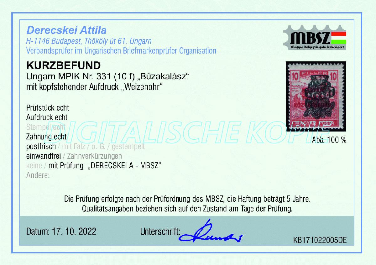 | Zusatzinformationen und Suchstichworte: | Ungarn MPIK Nr. 331 mit kopfstehendem Aufdruck "Weizenohr" |