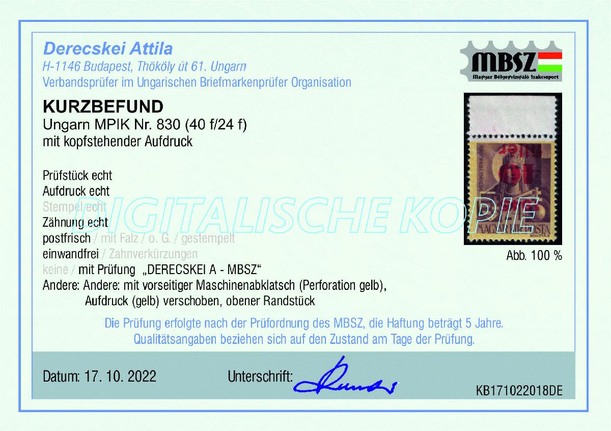 | Zusatzinformationen und Suchstichworte: | Ungarn MPIK Nr 830 mit kopfstehendem Aufdruck |