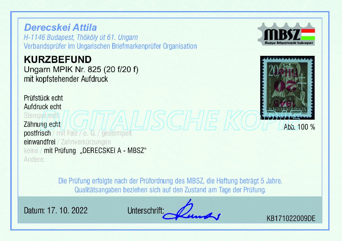 | Zusatzinformationen und Suchstichworte: | Ungarn MPIK Nr. 825 mit kopfstehendem Aufdruck |