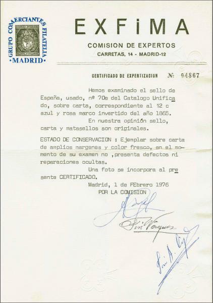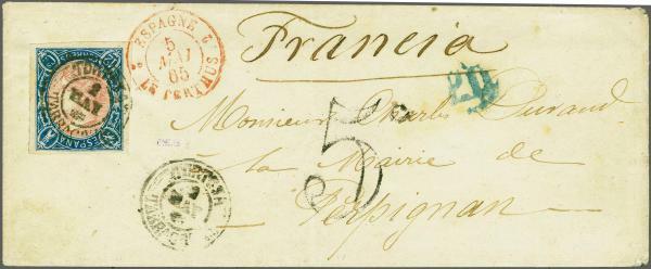 | Zusatzinformationen und Suchstichworte: | 291. - 297. Corinphila Auktion 28. November - 3. Dezember 2022 Los 3608 Spanien 1865 (May 2): Envelope from Tortosa to Perpignan, bearing 1865 12 cu. blue & rose imperf. showing the rare variety: inverted center, a superb example with large even margins in a vivid shade, tied by "TORTOSA TARRAGONA" despatch cds in black and part strike of crisp French "ESPAGNE 5 MAI 65 LE PERTHUS" entry cds in red. "P.D." in circle in blue alongside. Reverse with "ESPANA LA JUNQUERA" exit cds in blue and PERPIGNAN arrival (May 5) cds. Taxed in France with handstruck '5c' due following the Spanish - French postal convention. A splendid usage of this rarity of utmost attractiveness, for a connoisseur, cert. EXFIMA (1976) Edifil 70ei. Provenance: Collection Peter Brodtbeck, Corinphila sale 100 (June 1997), lot 2688. Ausruf 1.500,00 CHF |